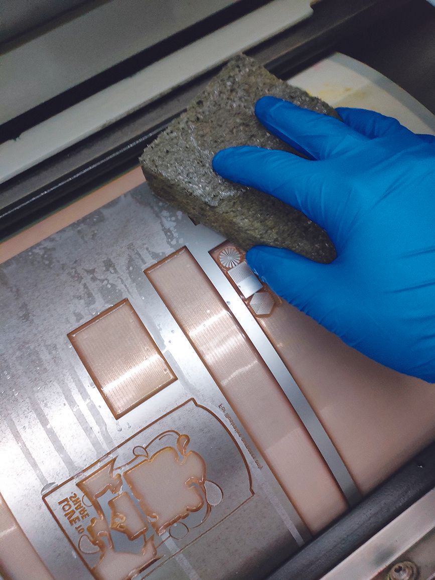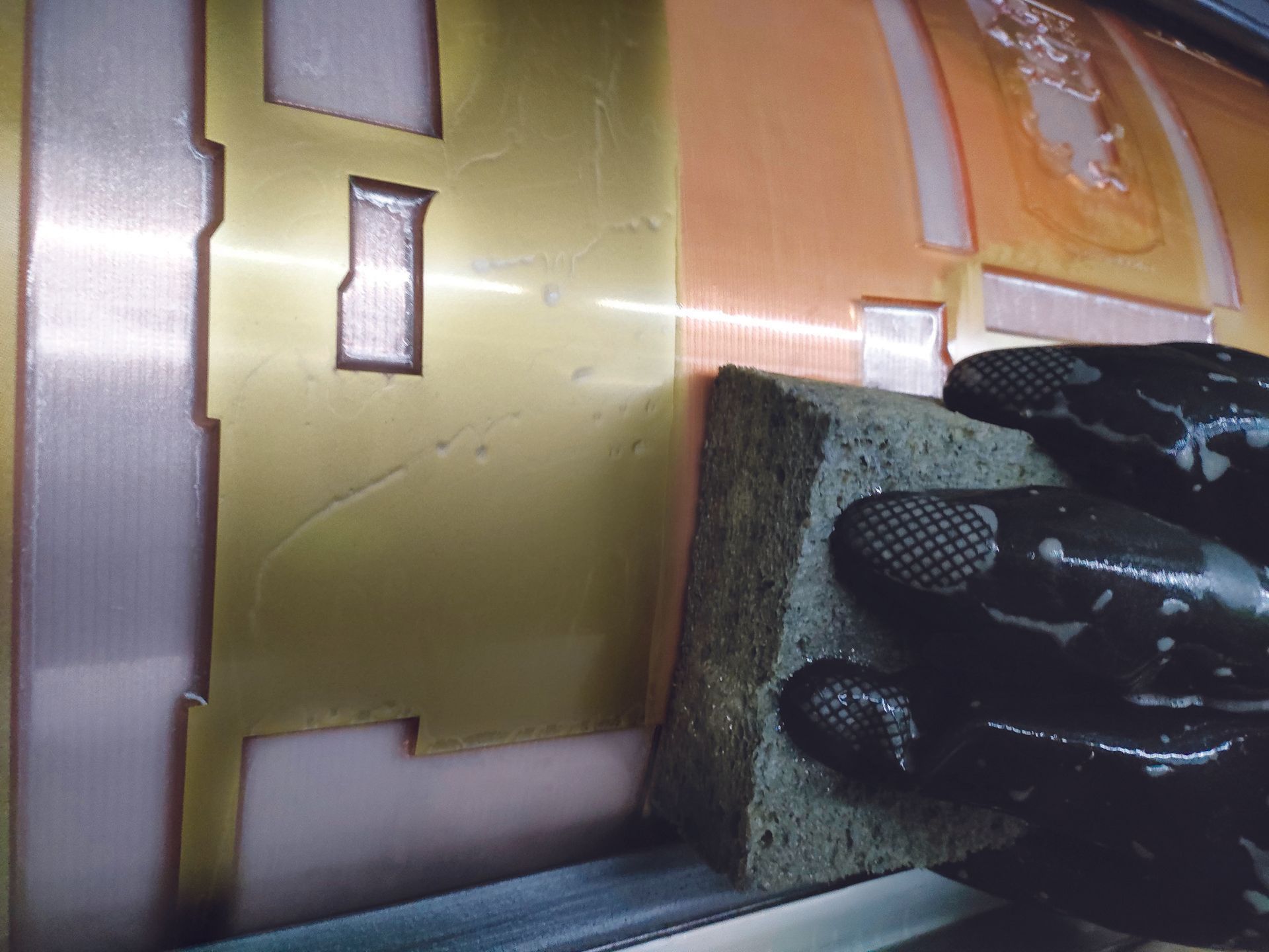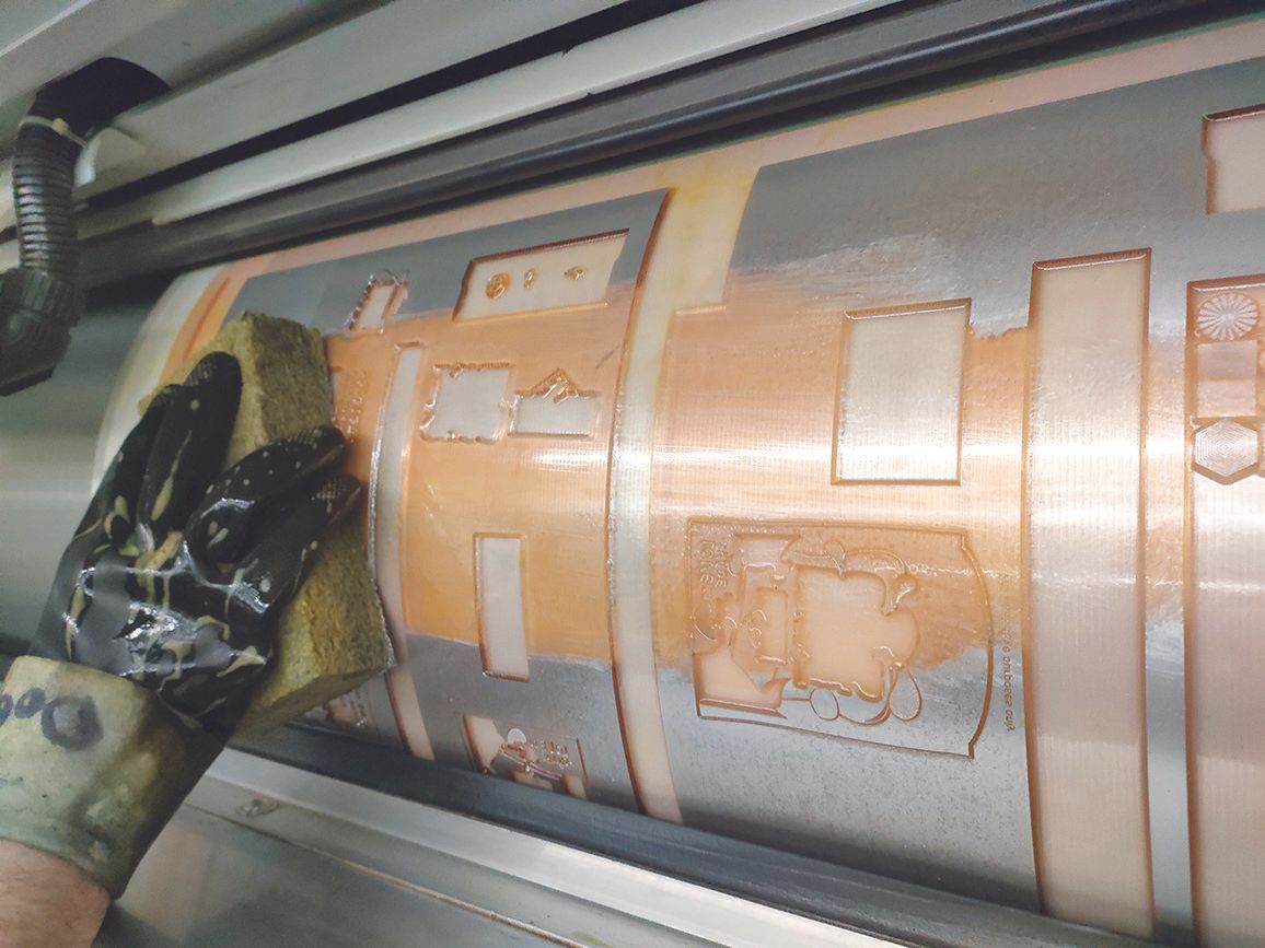 If not cleaned methodically and effectively, metallic inks can block anilox cells, contaminating the whole inking system. If left to dry solid, any metallic ink will become hard and brittle, resulting in small shards or particles dislodging. If these particles enter the ink chamber they can scratch or score anilox rolls, which are expensive to repair. If polymer printing plates are left to dry without immediately cleaning off the fresh metallic ink then more time and effort will be required to clean them.